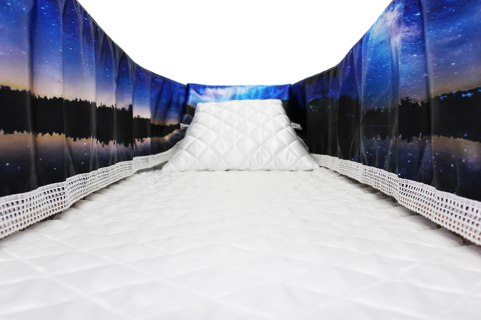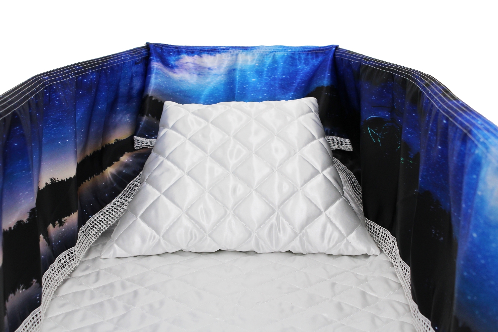 12-inch Printed Satin frill to be attached to the lip of the coffin/casket. Please note the image shows a mattress and pillow which are NOT included.