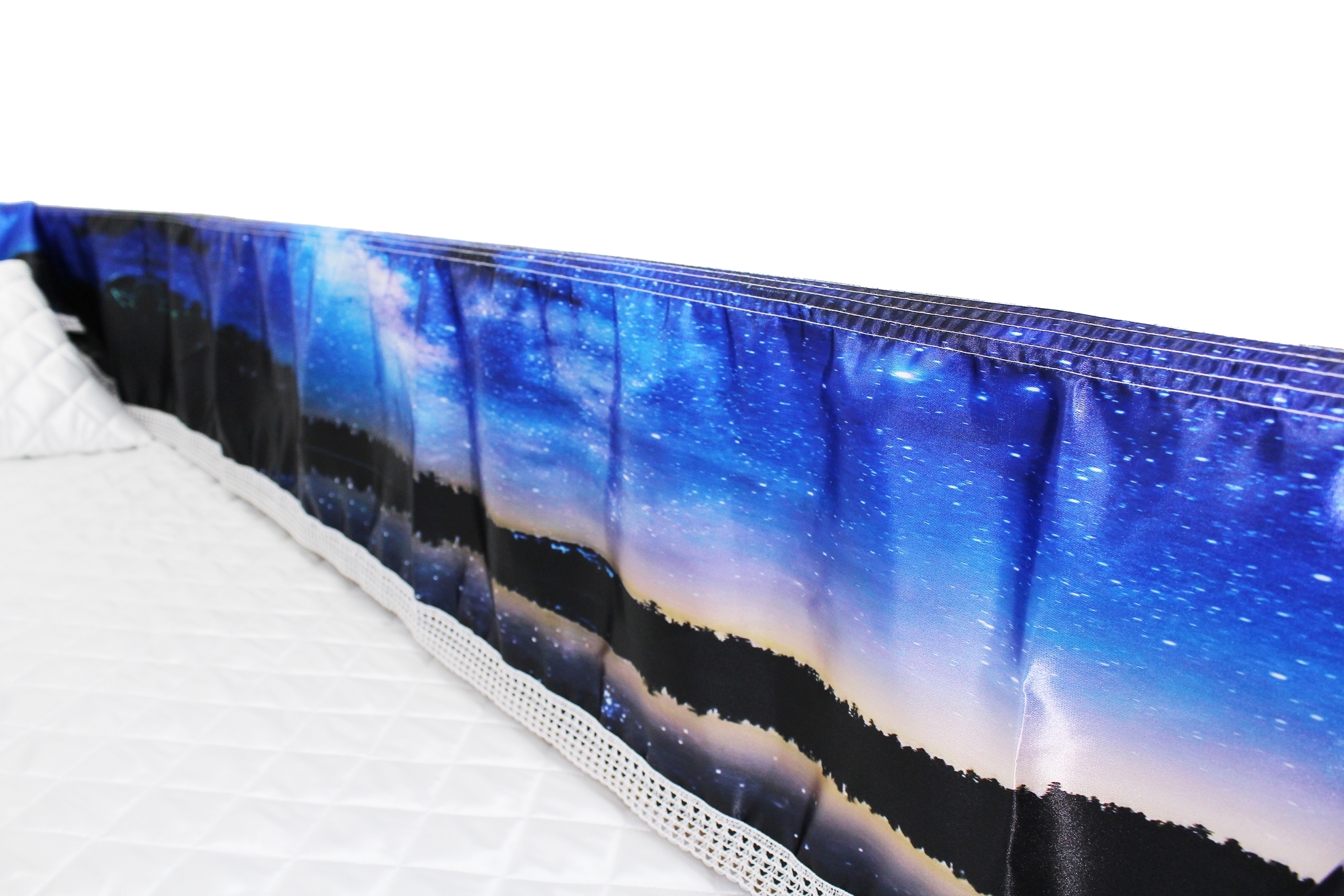 Luxury Satin 18-inch 2-way frill consisting of a 12-inch internal frill with an additional 6-inch exterior frill. The chosen design will be printed on the 18" 2-Way Frill. Please note the image shows a mattress and a pillow which are NOT included. Image is to illustrate style of Interior Only.